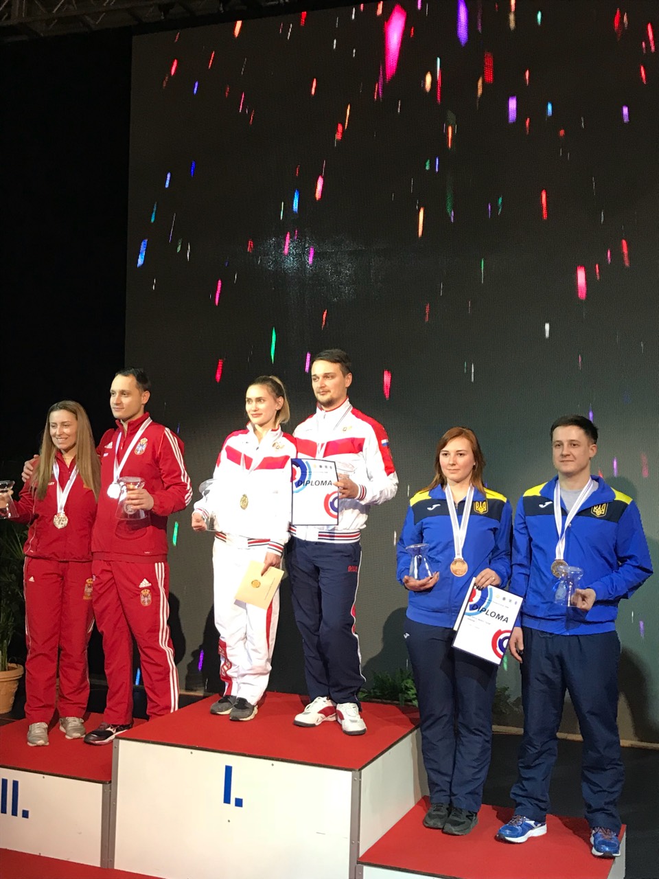 Також сьогодні проходили змагання серед змішаних пар з гвинтівки. Одразу дві українські команди змогли пробитись до фінальної частини змагань. Команда у складі Войцехівської Марії та Куліша Сергія набрала найбільшу кількість очок у кваліфікіціі (838,5), встановивши новий рекорд Європи та світу! Друга команда, у складі Ільіної Анни та Царькова Олега кваліфікувались до фіналу з результатом 837,1 оч. У фінальній частині змагань команда Ільіна/Царьков вибороли бронзові нагороди, з результатом 431,9 оч!
